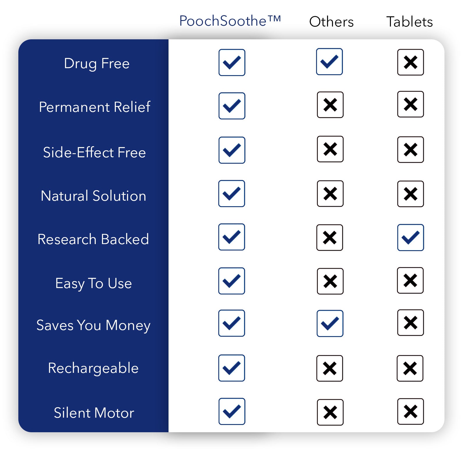 The PoochSoothe™ stands out as a superior choice for improving your dog's mobility and reducing pain compared to pharmaceutical tablets and alternative massage devices on the market.